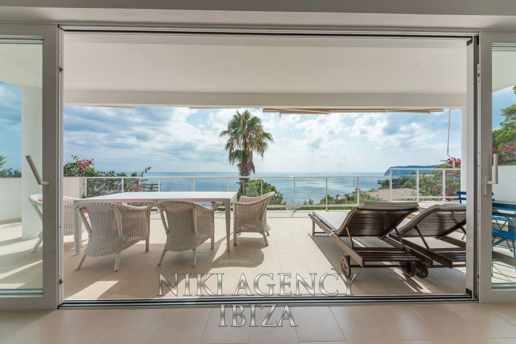Casa en Es Cubells con vistas al mar de 180º en la urbanización Vista Alegre. La casa tiene una superficie habitable de 128 m² y una parcela de aprox. 591 m². Al entrar en la casa, ya se puede admirar la fantástica vista al mar desde la entrada a través de las grandes puertas de la terraza. En un nivel hay un gran salón-comedor con acceso a la terraza con vistas al mar, una pequeña cocina independiente totalmente equipada, 2 baños y 2 dormitorios, uno de ellos con baño en suite. En el patio también hay un garaje para 1 coche y una plaza de aparcamiento. La casa fue construida en 1984 y se encuentra en muy buen estado de conservación.[IW]