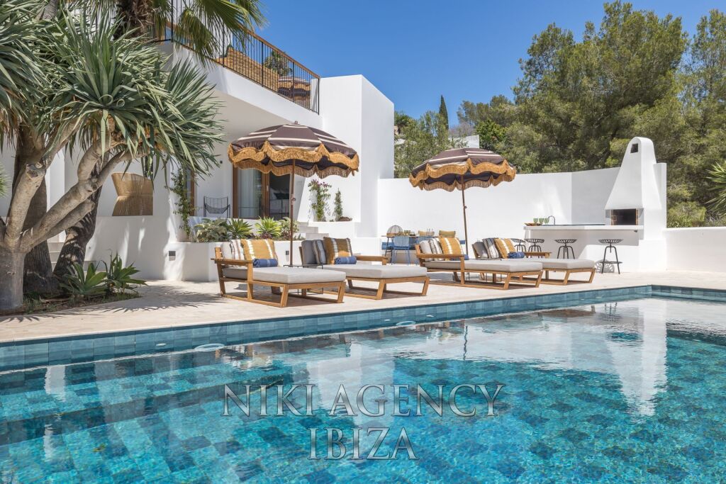 Esta villa de estilo mediterráneo con un toque de estilo bohemio-chic cuenta con 5 lujosos dormitorios y 5 baños. La casa tiene una superficie construida de 387 m² en un amplio terreno de 960 m². La vivienda se ofrece completamente amueblada y lista para entrar a vivir. La villa ha sido renovada recientemente con materiales de alta calidad que garantizan tanto lujo como calidad para una experiencia de vida sin preocupaciones. Al entrar en la planta principal, se encuentra en el área de salón, comedor y cocina de concepto abierto con una acogedora chimenea. Este espacio se extiende perfectamente hacia un balcón que rodea la casa y ofrece impresionantes vistas al exuberante jardín y a la brillante piscina. Desde aquí también tiene vistas a Dalt Vila y al mar. La refinada y completamente equipada cocina es un sueño, con una barra de cocina de piedra natural y también acceso al balcón envolvente. Los dormitorios de la villa son espaciosos y se encuentran en varios niveles. El dormitorio principal cuenta con una bañera moderna e independiente en la habitación. Cada uno de los baños está equipado con acabados modernos y lujosos, como baldosas de piedra natural, que crean un ambiente de spa. Además, esta propiedad incluye un apartamento de invitados independiente en un nivel inferior. Este apartamento se puede acceder a través de la escalera exterior por una entrada separada. El apartamento tipo estudio incluye su propia cocina, un dormitorio y un baño.